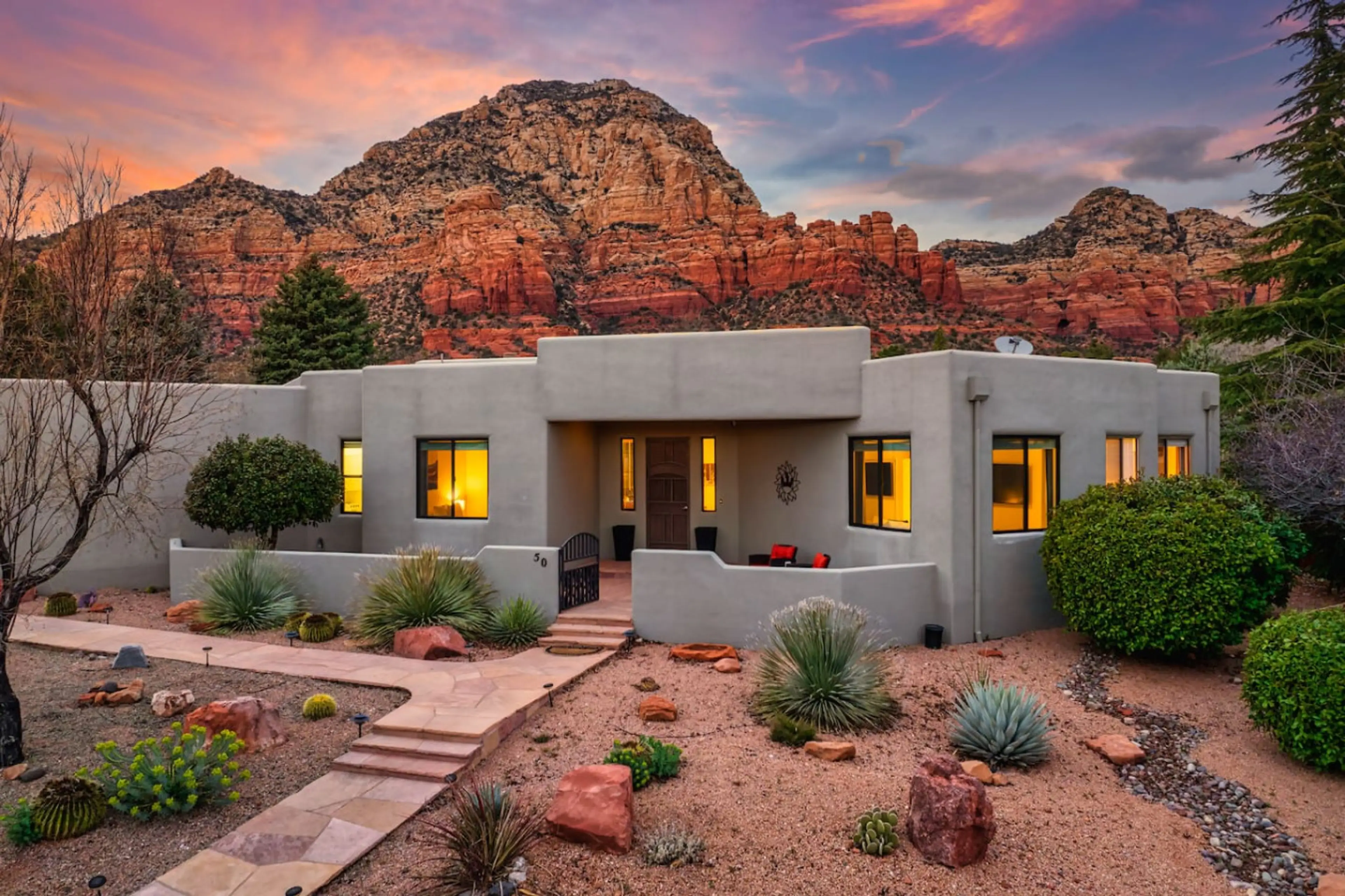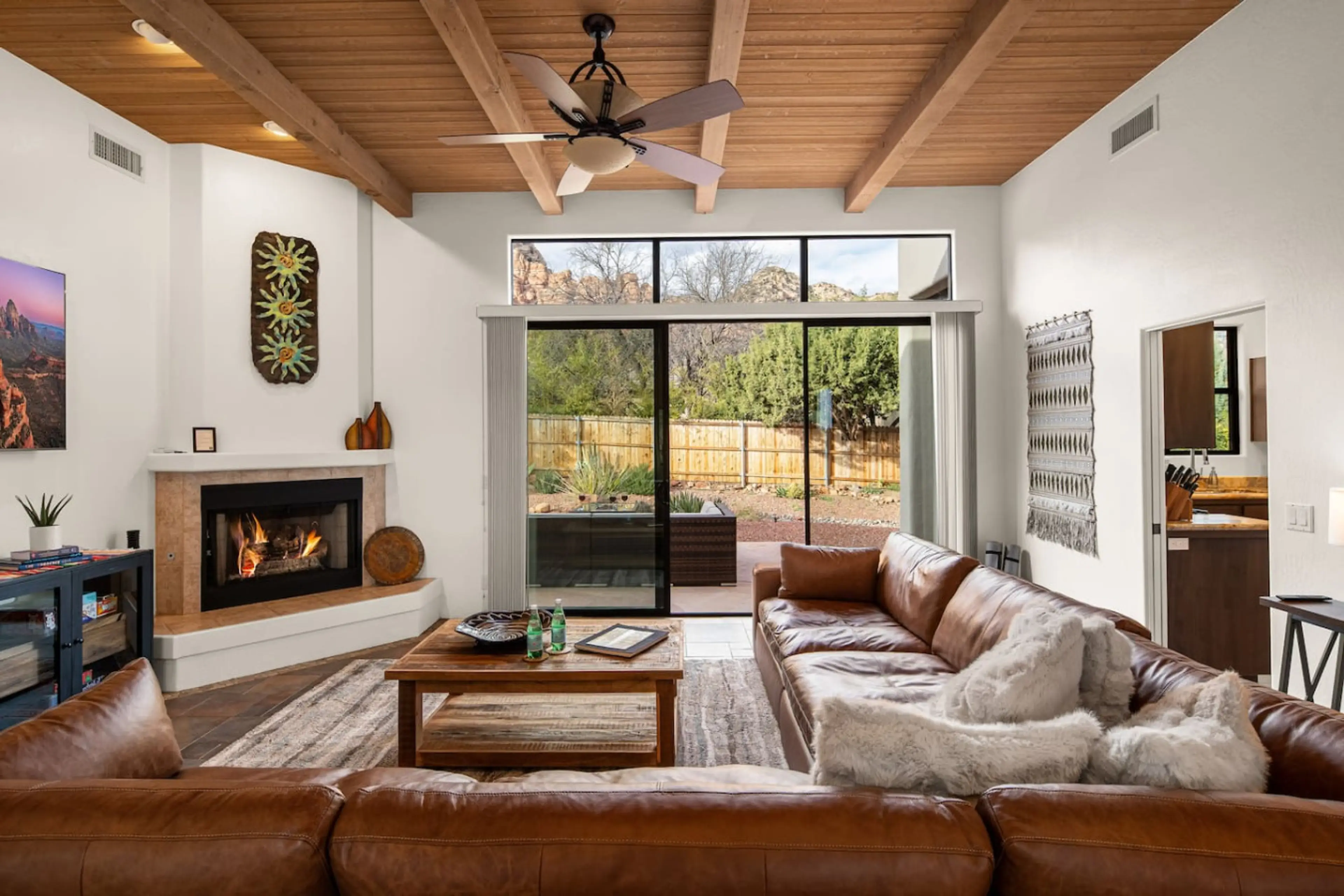 Experience the ultimate desert lifestyle in this boho chic retreat. Perfectly located in West Sedona with sweeping views, you are just a 5-minute walk from Sugarloaf Trailhead. This rare gem features 4 king bedrooms, making it an ideal retreat for groups. Relax by the fireplace, cook in the chef’s k...